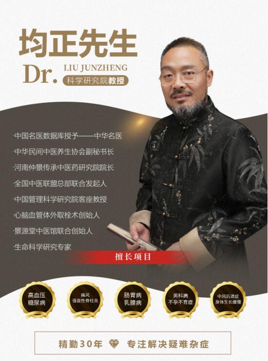 名家简介均正先生:全国中医联盟总部联合发起人中国红十字会救护员中国管理科学研究院客座教授中国名医数据库授予——中华名医时代人物论坛评为——抗疫英雄CCTV央视在线特聘——客座教授国家全民健康普及教育导师汉唐